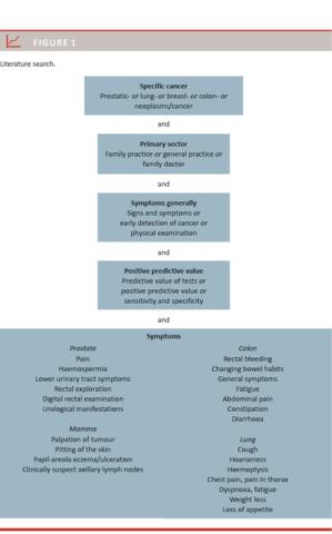 Waiting a long time for a diagnosis is associated with a poorer prognosis for cancer patients [1, 2]. In Denmark 2008 saw the introduction of accelerated, well-planned, fast-track diagnostic and treatment pathways, coined cancer packages, for patients suspected of having cancer. For each cancer type, the Danish Health and Medicines Authority developed a manual for general practitioners (GPs) describing the symptoms that should engender a reasonable suspicion of malignancy (alarm symptoms) and trigger the initiation of the diagnostic pathway. Naturally, the relevance of the manual depends on the ability of the alarm symptoms to predict cancer in a general practice population. Low predictive values may imply a waste of resources and unnecessary anxiety for patients. The aim of this review was to examine the evidence for PPV of the alarm symptoms described by the Danish Health and Medicines Authority in relation to the four most commonly occurring cancers in Denmark: colorectal cancer, lung cancer, prostate cancer and breast cancer. Furthermore, tools for calculation of PPV using combinations of symptoms and risk factors were examined.