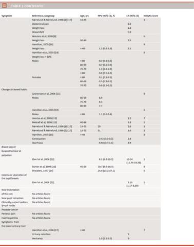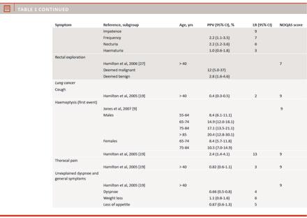 studies were found and no conclusions could be drawn about the value of these symptoms in daily clinical practice. However, significant and good quality evidence was found describing rectal bleeding and colorectal, suspect tumour at palpation and cancer mamma, positive findings from rectal exploration and cancer of the prostate as well as haemoptysis and lung cancer. A few studies have interesting results concerning age and gender. Rectal bleeding, changing of bowel habits and haemoptysis are more predictive for cancer in men than in women. Rectal bleeding is more predictive for colorectal cancer in age groups over 70 years, and haemoptysis is more predictive for lung cancer in age groups over 55 years. However, many of these methodological problems have been addressed in the method developed by Julia Hippisley-Cox et al allowing inclusion of many variables in the estimation of PPV of symptoms [35, 36]. As mentioned above, the results are based on data from a very large sample of patients and GPs which contributes to a high statistical power in the calculations.