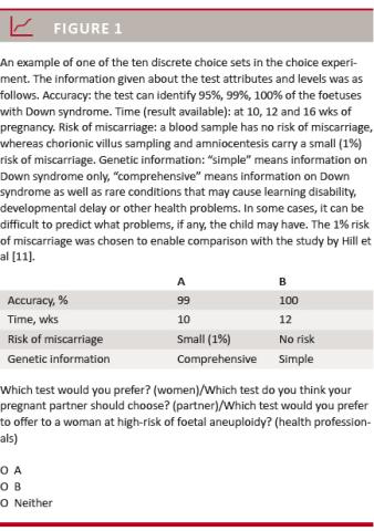 Carroll FE, Al-Janabi H, Flynn T et al. Women and their partners’ preferences for Down’s syndrome screening tests: a discrete choice experiment. Prenat Diagn 2013;33:449-56.