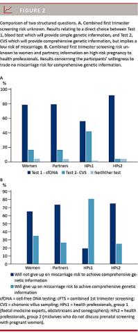 Figure 2B #PLACEHOLDER5 shows results for the participants’ willingness to trade no miscarriage risk for comprehensive genetic information; the health professionals were told before they should trade that they needed make a choice for a pregnant woman at high risk after cFTS. The