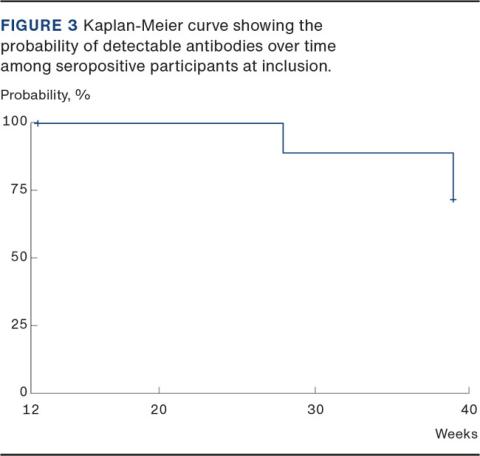 To investigate the effects of loss to follow-up and multiple follow-up measures of antibody detectability, we applied a survival analysis framework to investigate the duration of detectable antibodies in our cohort. We investigated the probability of having detectable antibodies over time, represented by study weeks. At the end of follow-up in study week 39, our survival analysis showed a probability of detectable antibodies of 72% (95% CI: 54-96.2%) (Figure 3).