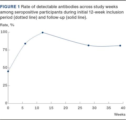 Among the healthcare professionals with detectable antibodies during inclusion, most were followed for five additional months with a high rate of antibody detection at the end of follow-up. When loss to follow-up was considered, the probability of antibody detection remained high.