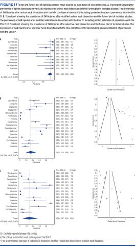 Results: Nineteen studies reported a total of 457 SAN injuries. The estimated prevalence of SS or SAN injuries following radical neck dissection, modified radical neck dissection and selective neck dissection was 94.8% (95% CI: 88.5-98.9%), 33.0% (95% CI: 19.4-48.3%) and 27.9% (95% CI: 7.1-54.5%), respectively. Five studies reported a total of 64 MMN injuries. The estimated prevalence following modified radical neck dissection and selective neck dissection was 13.1% (95% CI: 0-37.6%) and 12.7% (95% CI: 4.3-24.1%), respectively.