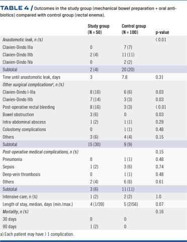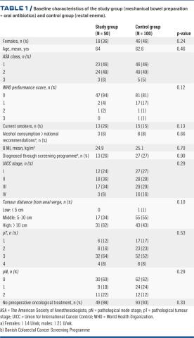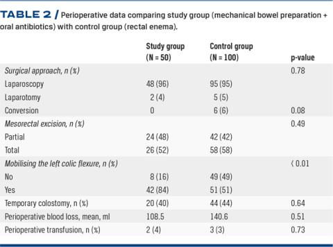 METHODS: This was a retrospective, single-centre analysis of patients undergoing surgical treatment for rectal cancer. We included 150 consecutive patients treated from July 2014 to October 2018. From June 2017 onwards, 50 patients comprised the study group (receiving MBP and oral antibiotics), while the preceding 100 patients served as a control group (receiving a rectal enema).