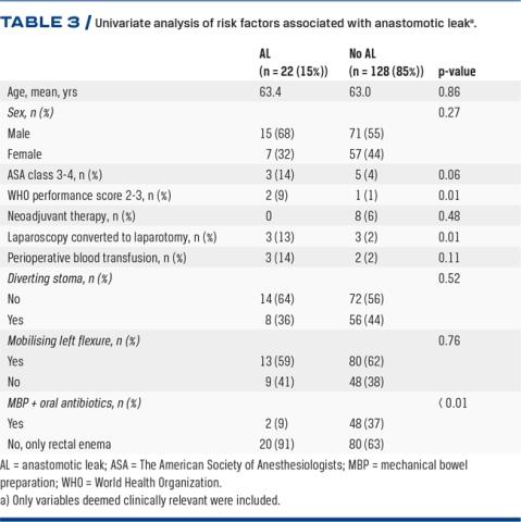 In two otherwise comparable groups, AL rates seem to be lowered by administering MBP combined with oral antibiotics prior to surgery for rectal cancer. Furthermore, AL seems to be more common in patients with a World Health Organization performance score of 2-3 or when conversion from laparoscopy to laparotomy is done. Though not significant, a difference in UICC stage and tumour level was recorded favouring the study group – possibly influencing the difference in AL rates between the two groups.
