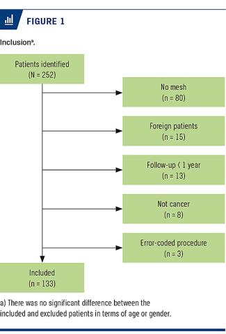 METHODS: In the period from 2010 to 2016, we included 133 patients who had a permanent colostomy with prophylactic mesh placement due to rectal cancer. The patients were seen in the ostomy ambulatory at least three times annually, and bulges and hernias were registered by a trained nurse. Computed tomography was used for verification of parastomal hernia. Data were registered retrospectively from patient files.