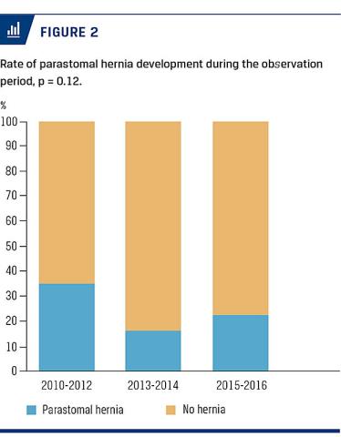 patients who did not have a mesh placement were excluded. Patients who did not undergo follow-up in the outpatient clinic for at least one year were excluded. Patient charts were examined for demographic data, comorbidity and downstaging chemotherapy and/or radiation. The Union for International Cancer Control (UICC) staging was extracted from the pathology database in each case. All included patients had three annual follow-up visits in the outpatient ostomy clinic in the course of at least one year, and from the charts we noted whether the patient had developed a parastomal bulge (PSB) or a PSH. A PSH was defined as herniation of intra-abdominal contents (not the ostomy bowel) intimately connected to the ostomy. A PSB was defined as an elevation around the ostomy that was either claimed to have been observed by the patient or suspected by a trained nurse in the stoma outpatient clinic. A PSB could be due to seroma, scar tissue or a subcutaneous prolapse of the ostomy bowel, which is not defined as a hernia [12]. All patients were undergoing annual CT’s for three years as part of their cancer control; in case of uncertainty about a bulge, a specific scan for hernia was performed. A radiologist not affiliated with the project was consulted to state the fact of herniation in case of doubt about the classification. In order to investigate a potential surgical learning curve, we compared the PSH rate in the three periods 2010-2012, 2013-2014 and 2015-2016.