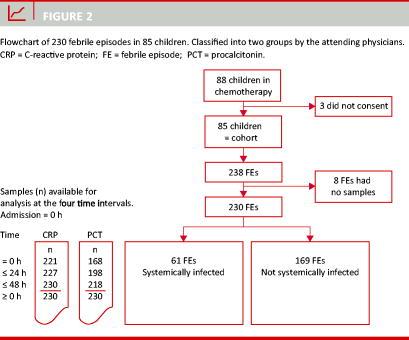 A total of 88 children with cancer were treated with chemotherapy at our centre during the study period. A total of 85 consented to participate and constituted the studied cohort. Age ranged from four months to 15 years (median 5.7 years): 45 had haematological cancer, 40 had solid tumours. Altogether, the children were admitted 238 times due to an FE, and the mean number of admissions per child was 2.8 (range 0-10). In eight of these FEs, no PCT or CRP samples were taken. In 230 FEs, we consecutively recorded all data as presented below. PCT and CRP were measured 787 and 998 times, respectively. In a few FEs, CRP was measured more frequently than PCT because of rapid clinical deterioration. Among the 230 FEs, 198 and 218 had PCT sampled within the first 24 and 48 hours, respectively. Similarly, 227 and 230 had CRP sampled within the first 24 and 48 hours, respectively (Figure 2). A total of 110 (48%) of the FEs were neutropenic with an ANC < 0.5 x 109/l at admission.