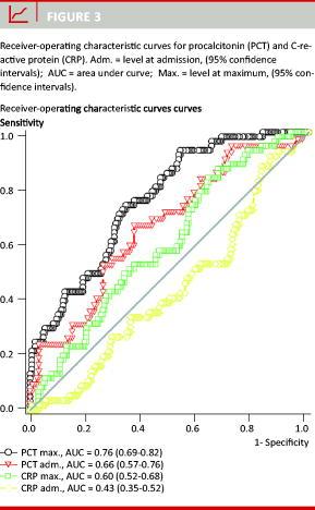 Conclusion: PCT measurement considerably improves biochemical information; however, the sensitivity is too low to safely alter the recommended administration of empirical antibiotics at admission.