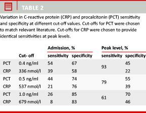 PCT had a significantly higher specificity than CRP at equal levels of sensitivity (p values ≤0.01). PCT was more sensitive at admission than CRP. The sensitivity was 93% at the lowest shown cut-offs of PCT (0.4 ng/ml) and CRP (336 nmol/l). The specificity was 45% and 22%, respectively (Table 2).