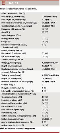 Results: A total of 73 neonates and their mothers were included. Caesarean delivery was given in 78% of the cases. Maternal risk factors included gestational hypertension (33%), smoking (24%) and placental infarction (17%). Hypoglycaemic episodes developed in 31% of the neonates. At 12 months, 90% had caught up growth and 7% had a neurologically poor outcome. No infants died.