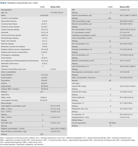 Baseline characteristics are summarised in Table 1. The median age was 72 years (IQR: 60.5-81 days) and 54.8% were male. The most frequent comorbidities included hypertension (32.3%), CPD (22.1%), diabetes with or without complications (19.8%), any cancer (15.2%), atrial fibrillation (14.1%), cerebrovascular disease (14.1%) and dementia (11.4%). The median CCI score was 1 (IQR: 0-2): 92 (35.0%), 73 (27.8%), 46 (17.5%) and 52 (19.8%) patients scored 0, 1, 2 and > 2, respectively. Furthermore, most patients were lymphopenic with elevated levels of blood glucose, fibrin D-dimer, ferritin, CRP, and lactate and dehydrogenase (LDH), whereas albumin levels were mostly decreased (Table S2). Several abnormal biochemical markers significantly co-occurred, whereas for comorbidities only diabetes and renal disease co-occurred (Supplementary data). On admission, 120 patients (45.6%) required supplemental oxygen: 236 patients (89.7%), 14 (5.3%), and 13 patients (4.9%) required ≤ 5, 6-10 and > 10 l/min. of supplemental oxygen, respectively (Table 1).
