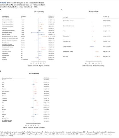 In univariable analyses of the association of individual comorbidities and blood results with 90-day mortality, we found a significantly higher mortality in elderly patients with known peripheral artery disease, cerebrovascular disease, dementia, moderate to severe liver disease, metastatic cancer and alcohol abuse (Figure 2A). Due to considerable missing data on fibrin D-dimer, ferritin and HbA1c (Table 1), we excluded these patients from further analysis. We next demonstrated a significantly higher mortality in patients with abnormal haemoglobin, white blood count, absolute neutrophil count, platelets, CRP, sodium, creatinine, urea, international normalised ratio, amylase and alkaline phosphatase (Figure 2B). For vital signs, an increased pulse, respiratory rate, need of supplemental oxygen and early warning system score at time of admission were associated with higher mortality (Figure 2C).