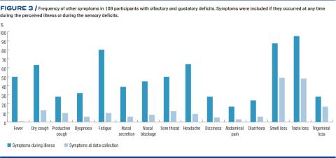 We found that participants predominantly complained of combined olfactory and gustatory loss (100/109). They reported a high frequency of anosmia (82/100) and/or ageusia (72/104) with a rare occurrence of qualitative deficits. Whereas participants had recovered from most symptoms, the chemosensory deficits often persisted.