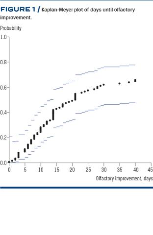 In a study of hospitalised COVID-19 patients, two thirds of the 53 patients with reported chemosensory dysfunction reported complete recovery of symptoms. Half had a duration of chemosensory loss less than five days [5]. In an assessment of 59 clinically cured hospitalised patients, the short-term olfactory recovery rate was 44%, whereas 72.6% recovered olfactory function within the first eight days following the resolution of the disease [1]. However, whereas most COVID-19 hospitalisations are due to lower respiratory symptoms [20], chemosensory loss in COVID-19 is associated with a milder clinical course of COVID-19, indicating a more severe affection of the upper airways. As such, these reports may not be representative of the chemosensory improvement and recovery in the majority of patients with COVID-19 associated chemosensory loss.