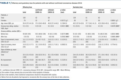 Results: Among the 109 study participants, 95 had a combined olfactory and gustatory loss, five participants had isolated olfactory loss and nine participants has isolated taste loss. The mean age of participants was 39.4 years and 25% of participants were under the age of 30 years. Young age was not associated with a higher recovery rate. After a mean time of > 30 days since the chemosensory loss, participants reported relatively low recovery and improvement rates. For participants with olfactory loss, only 44% had fully recovered, whereas 28% had not yet experienced any improvement of symptoms. After gustatory loss, 50% had fully recovered, whereas 20% had not yet experienced any improvement. Olfactory and gustatory deficits were predominantly quantitative and mainly included complete loss of both olfactory and gustatory function.