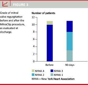Results: MR was reduced in all but one patient, generally from grade 3.5 ± 0.5 to grade 1.4 ± 0.9. A total of four patients (25%) received two clips. Thirty-day complications were as follows: one patient died, one had a stroke (speech sequelae), one patient had a new chord rupture that was treated surgically. During 90 days of follow-up, symptoms of dyspnoea diminished (reduction of 1 NYHA grade) and the 6-minute walk test results improved from 171 ± 99 to 339 ± 134 metres (p < 0.001).