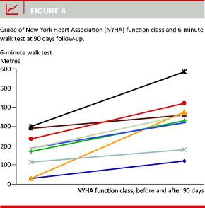 In the group of patients with 90-day follow-up, improvement in 6MWT distance rose by a mean 171 ± 99 metres to 339 ± 134 metres (p < 0.001) (Figure 4). Symptoms of dyspnoea were also reduced by the treatment. Before treatment, all patients were in NYHA function class III-IV, but at the 90-day follow-up, eight of the 11 patients were in NYHA function class I or II, three patients remained unchanged in NYHA class three (Figure 4). Most patients could be reduced in diuretic treatment.