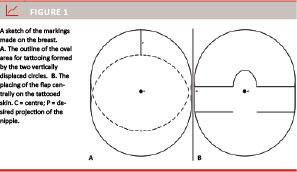A ring areola marker with a diameter identical to the desired diameter of the new areola was placed on the breast mound. Two circles were then marked, displaced either vertically or horizontally with a distance equal to the desired projection of the new nipple (Figure 2B). The circumference of the oval area outlined was then marked superficially on the skin by a scalpel prior to removing the permanent marker (Figure 2C). This outline was used as a scaffold for medical tattooing (Figure 2D).