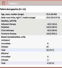 A total of 22 women were included in this study (Table 1). The median age was 53.5 years (36-69 years). The median body mass index (BMI) was 24.5 (20.0-37.9) and four of our patients were smokers (18.2%). Co-morbidity included one case of diabetes (4.5%) and five cases of hypertension (22.7%). A large proportion of the patients had adjuvant therapy in relation to their breast cancer treatment including radiation therapy (n = 10, 45.5%), chemotherapy (n = 8, 36.4%) and antihormone therapy (n = 13, 59.1%). In all cases, radiation and chemotherapy were given prior to the NAC reconstruction whilst antihormone therapy was continuous following the mastectomy and thus both before and after NAC reconstruction. The median time from mastectomy to NAC reconstruction was 14.5 months (5-63 months).