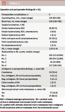 Conclusion: The SN procedure can be used for endometrial cancer and it has a high detection rate and no false negative SNs were detected. The sensitivity of the SN procedure may be increased by the use of single-photon emission computed tomography (SPECT)/computed tomography (CT) and peroperative cytokeratin (CK) staining of the SN(s).