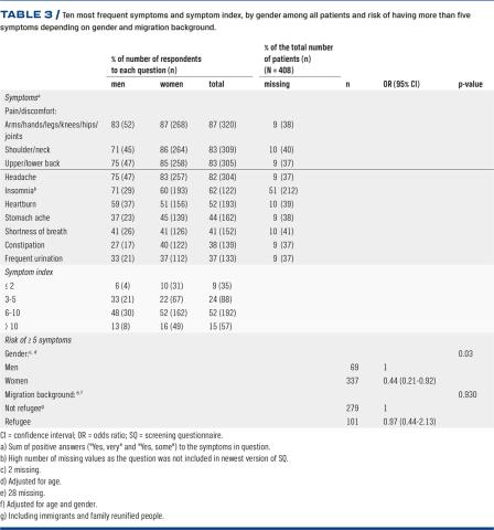 Table 3 shows the distribution of the ten most reported specific symptoms by gender along with a symptom index grouping the patients by number of symptoms reported. The predominant symptoms were pain-related, arising from the musculoskeletal system. The majority (62%) reported sleeping difficulties, more often men (71%) than women (60%). Gastrointestinal symptoms as well as less organ-specific somatic symptoms were common. The majority of patients (87%) reported ≥ 5 symptoms. Results from the logistic regression analysis showed a statistically significant protective effect of being a woman as compared with being a man on the risk of having more than five symptoms (odds ratio = 0.44; 95% confidene interval: 0.21-0.92), whereas no protective effect of being a refugee was identified.