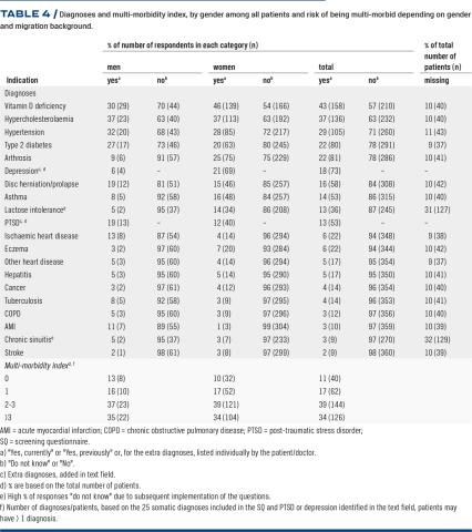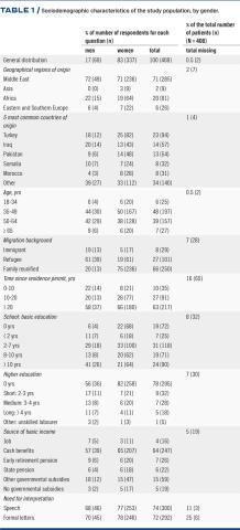 RESULTS: The patients, among whom 83% (n = 334) were women, represented 43 nationalities and had a mean age of 49 years. A total of 19% (n = 78) had no formal schooling. More than 70% (n = 287) reported an (oral and written) interpreter need despite most (63%) having resided in Denmark for > 20 years. Reported symptoms were often pain-related, and 87% (n = 355) reported ≥ 5 symptoms. Multi-morbidity (≥ 2 reported diagnoses) was seen in 73% (n = 298) of the patients. Women had a significantly lower odds ratio (OR) of having > 5 symptoms (OR = 0.44; 95% confidence interval (CI): 0.21-0.92) and an insignificantly lower risk of multi-morbidity (OR = 0.76; 95% CI: 0.40-1.43) than men; no significant differences were seen according to migrant status.