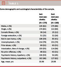 As described previously [8], the participants were mainly unemployed, single males, often without their own home, most had been in contact with the psychiatric health-care system, and abuse of alcohol and drugs was highly prevalent. The mean age was around 30 years; the age range spanned from 15 to 71 years. When including the near-psychotic cases, 50% (138/275) were sentenced to a psychiatric measure compared with 33% (68/203) when excluding the near-psychotic cases.