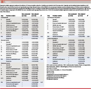 Material and methods: Questionnaire study among 97 consecutively recruited inpatients (72.2% male; mean age 60.6 years) with acute coronary syndrome. We examined the role of socio-demographic, illness-related and psycho-social factors (Multidimensional Scale of Perceived Social Support, General Self-Efficacy Scale and Life Orientation Test-Revised) for perceived consequences, controllability and causes (Revised Illness Perception Questionnaire) with standard multiple regression.