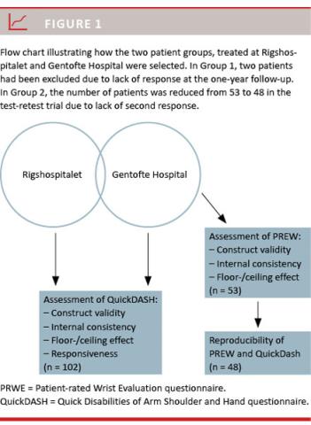 Group 2 consisted of a subset of Group 1: we included only the patients from Gentofte Hospital. This group was used for the general assessment of the PRWE and of the reproducibility of the QuickDASH (Figure 1).