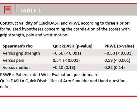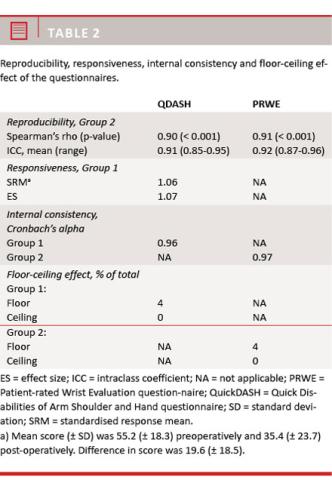 Material and methods: In a prospective cohort of 102 cases, we evaluated the QuickDASH. Furthermore, in a cross-sectional study and a test-retest on a subgroup of the patients, we evaluated the Patient-rated Wrist Evaluation.