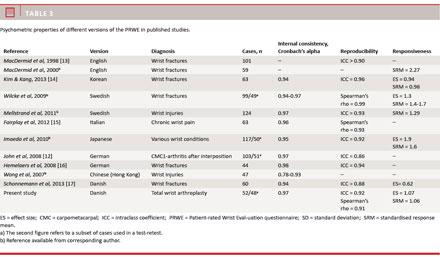 At present, no systematic review of the psychometric properties of the PRWE is available, and it is far beyond the scope of this study to do so with the COSMIN method, but we have identified a number of relevant papers. Table 3 shows a summary of the internal consistency, reproducibility and responsiveness in these studies. A weak correlation with wrist motion and a moderate correlation with grip strength were found in patients with tendon interposition arthroplasty [12, 16, 18]. Correlations with VAS scores were moderate [14, 16, 17]. Fairplay et al found a high internal consistency (Cronbach’s alpha = 0.96) and reproducibility (Spearman’s rho = 0.93) in 63 patients with chronic wrist or hand pain [15]. These figures also are consistent with our findings in TWA patients.