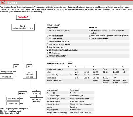 On arrival, ED patients are evaluated by trained triage nurses who allocate the patients into one of three categories (red, blue and white) based on the perceived severity of their injuries or illnesses according to common regional guidelines [6] and clinical judgment. The most severely ill and injured patients are marked as ‘‘red’’. These patients need immediate or acute treatment. Our ‘‘red’’ patients undergo further evaluation to assess whether an EC or TC is warranted. This is a two-step process as illustrated in Figure 1. When the criteria for EC or TC are fulfilled, a multidisciplinary team (Figure 1) is sent for to make an initial assessment and to resuscitate the patient. When necessary, the team can send for the on-call specialists in cardiology, neurology and abdominal surgery. Once the patient is stabilized, further treatment and patient responsibility are transferred to the attending physician from the ward at which the patient is admitted.