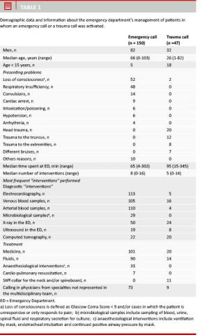 Material and methods: A retrospective evaluation was made of all ECs and TCs registered during a six-month period. Information on sex, age, interventions at the ED, time spent at the ED and outcome measures (admission, Intensive Care Unit (ICU) admission and death) were obtained. The quality of the acute medical treatment during the ED stay and the first 48 hours of admission were evaluated by senior consultants from the departments receiving the patients.