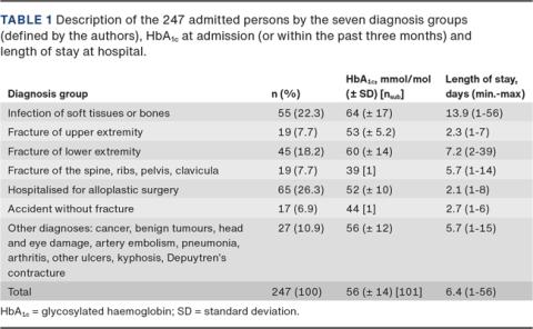 Approximately 10% of hospitalised patients in orthopaedic departments in the Capital Region of Denmark suffer from diabetes and the hospitalisation time of patients with soft tissue infections is long; two weeks on average. The audit also showed that blood glucose is generally measured according to guidelines, whereas treatment of an elevated blood glucose level is far from being given according to guidelines. This may potentially delay recovery and prolong hospitalisation periods.