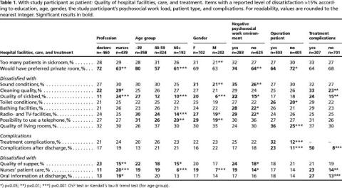 Table 1 shows the distribution of answers according to education, age, gender, the study participants' own psychosocial work load, patient category, and treatment complications. It appears that a vast majority would have preferred to have a private room, in particular among the youngest, among doctors, and among the group reporting a negative psychosocial work environment, defined as either a "much too fast work pace" and/or "little or no influence on work planning". More women than men found that there were too many patients in the sick room. The median number of patients in the sick room for those who reported that they would have preferred a room of their own was 3.5, compared to a median of 2.0 for the whole group of patients. Furthermore, this group was significantly more dissatisfied with the following physical facilities: sound conditions, cleaning quality, toilet and bathing, radio- and TV, access to telephone, quality of living rooms, and the quality of supper. Treatment complications during and after discharge did not differ (data comparing those who would have preferred a room of their own with those who did not are not shown in table form).