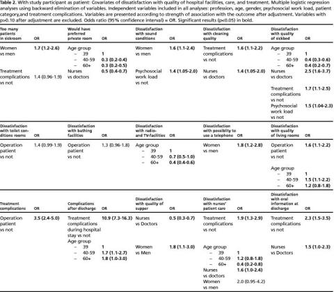 Table 2 shows which of the six participant subgroups were significantly associated with the items and conditions shown in Table 1 after multivariate analyses. Among the fifteen items, being an operation patient was the only significant covariate of dissatisfaction with respect to three conditions: dissatisfaction with toilet conditions, bathing facilities, and treatment complications, and the strongest covariate with respect to dissatisfaction with the quality of living rooms. Statistically, the strongest association with four other items: cleaning quality, complications after discharge, nurses' patient care, and dissatisfaction with oral information at discharge, was found for the group with treatment complications. This group also had the strongest odds ratio with respect to complications after discharge, 10.9. Most other odds ratios were not very high, in agreement with the relatively small differences between patient subgroups in the proportion of complaints for most items presented in Table 1.