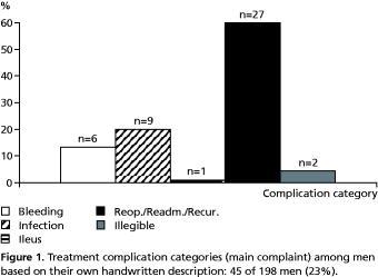 Figure 1 and Figure 2 show the distribution of categories of treatment complications among men and women, respectively. Of the 908 study participants, 867 subjects had answered the question on complications. Patients were categorized according to their main complication. For both groups bleeding and infection were quite frequent dominant complications, but a variety of complications seem to be important for both groups, including complications having caused re-operation, re-admission or recurrence of the disease.