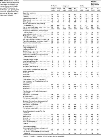 Table 3 shows quality of general conditions, communication, care and treatment, stratified according to profession, age, gender, and perceived psychosocial work load of the reporter. Reporting concerned most frequently mothers, least frequently boys. Of the nine reporter subgroups presented, only two differed statistically; reporting on spouses was most frequent among males, and among the oldest.