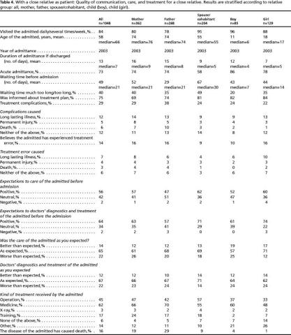 Table 4 shows quality of communication, care and treatment for a close relative, stratified according to relative group: all, mother, father, spouse/cohabitant, child (boy), child (girl). In this table a high degree of consistency in the distribution of answers is observed, independent of relative group. Applying our previously used pragmatic level of relevant dissatisfaction (>15%), waiting time was found too long for about 20 to 50% of relatives. A fair level of satisfaction with nurses' communication with the relative was found, but not with the care, where approximately 20% were dissatisfied. Around 25% were dissatisfied with the doctors' communication with the admitted, and between 16 and 26% were dissatisfied with the diagnostics and treatment performed by the doctors.