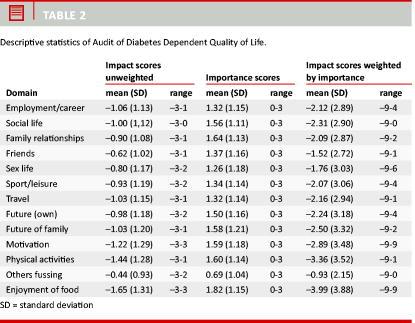 The distribution of responses regarding ADDQoL items and the weights assigned to impact rating is shown in Table 2. All items had a negative mean value, indicating that diabetes negatively impacted their quality of life. On the other hand, 15 participants indicated benefits of having diabetes. Eleven items of the ADDQoL instrument elicited responses indicating some positive effects of diabetes on the items concerning employment/career, family relations, friendship, sex life, sport/leisure, travel, personal future, future of the family, motivation, physical activities and enjoyment of food. Weighted scores ranged from –9 to 0 for two of the 13 items, with wider response ranges for the 11 items where a positive impact of diabetes was indicated. Diabetes has the largest impact on enjoyment of food (mean impact rating –1.65) and the least impact on others fussing (–0.44). Enjoyment of food and family relationships were rated as the most important items (mean importance rating 1.82 and 1.64, respectively) and others fussing (0.69) as the least important item. Enjoyment of food remained as the most and others fussing as the least affected quality of life items, respectively when the weighting was considered.