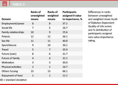 Table 3 shows the differences in rankings between unweighted and weighted means and percentage distribution of participants who assigned a zero value to the importance rating.