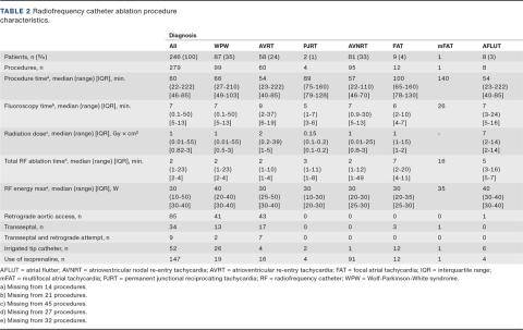 RESULTS: A total of 304 patients (148 girls) underwent EPS (352 procedures). RFA was performed in 246 patients (279 procedures), aged 13 (1-15) years and weighing 46 (6-99) kg. Treatment success was achieved in 195 (79%) of the initial procedures. Using more than one procedure, 227 (92%) patients were free from arrhythmia after 89 (26-143) months of follow-up. The procedure time was 60 (22-222) min. and ablation time 2 (1-23) min. Major complications occurred in two cases. One patient developed transient superior vena cava syndrome and one patient developed an atrioventricular block requiring pacemaker implantation.