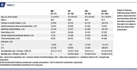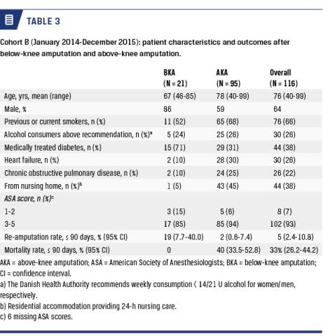multidisciplinary programme with increased attention to amputation patients. The patients’ 30-day and one-year overall mortality rates dropped from 35% and 59% to 16% and 37%, respectively [12]. A remarkable discrepancy was found when comparing the BKA/AKA ratio of 21/95 in our cohort B with the 71/58 ratio reported by Kristensen et al [12]. The known frailty in AKA patients with poor rehabilitation potential [13] may therefore be a part of the explanation for the high mortality rate found in our cohort. Furthermore, the bulk of amputation patients in our cohort had an ASA score of 3-5 (87% in cohort A and 93% in cohort B), while Kristensen et al reported 69% with ASA score 3-5. Finally, we chose to include bilateral cases and found that mortality was even higher in these cases (50% in cohort B), which could add to the higher mortality rate compared with other studies in which bilateral cases were excluded. Thus, the patients analysed in our study seem to have been more at risk than the patients from the recently published Danish single-
