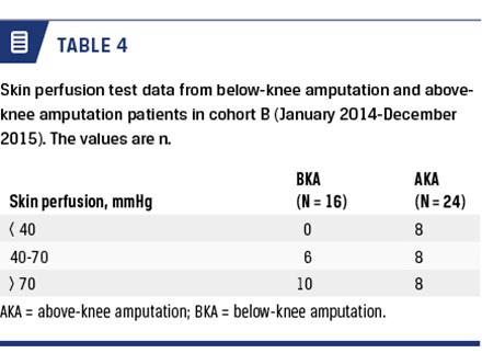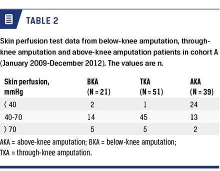 From 1 January 2009 to 31 December 2012 (Table 1 and Table 2). A total of 180 major lower-extremity amputations were performed in 167 patients. A total of 13 patients were bilaterally amputated. Skin perfusion tests were performed before 21 of the 27 BKA procedures (78%), 51 of the 68 TKA procedures (75%) and 39 of the 85 AKA procedures (46%).
