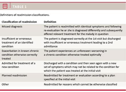 – Occurrence of readmission within 30 days of admission to ED. An estimate of the reason for readmission was classified according to the following five categories: missed diagnosis, insufficient or erroneous treatment of an identified condition, exacerbation in known chronic condition otherwise correctly treated, admit-