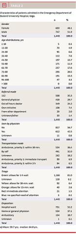 A total of 1,440 patients were admitted during November 2014. The mean age of the patients was 60 years, and the male-female ratio was 52:48. Data regarding referral mode are summarised in Table 2.