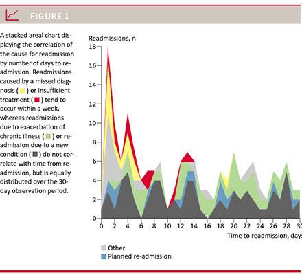 Using the stacked-area chart function in Microsoft Excel, the reason for readmittance was plotted against time to readmittance from the initial visit to the ED.
