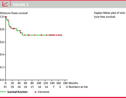 Ten patients (24%) had long-term complications related to bile duct stricture. The median follow-up in this subgroup was 126 (43-172) months (Table 2). Biliary strictures were diagnosed a median of 11 months after HJ repair. A Kaplan-Meier estimate of stricture-free survival is shown in Figure 2 .