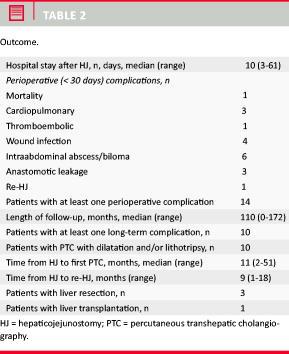 Long-term complications: Defined as biliary complications (strictures, stones, cirrhosis) requiring invasive procedures (invasive radiology or surgery) more than 30 days postoperatively. Due to the lack of generally accepted definitions and objective end-points, cholangitis per se was not registered as a complication, though suspected episodes of cholangitis obviously warranted further investigation, often PTC.